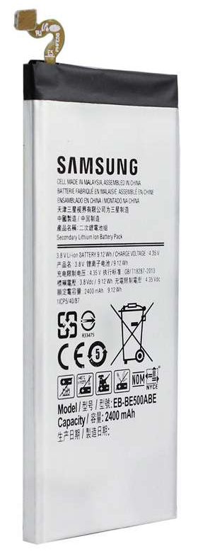باتری اورجینال سامسونگ گلکسی E5 با عنوان شرکتی EB-BE500ABE از کیفیت ساخت بالایی برخوردار بوده و برای مصرف کننده شش ماه گارانتی می شود. این باتری دارای ظرفیت 2400 میلی آمپر ساعت با ولتاژ 3.8 ولتی بوده و از نوع لیتیوم یونی می باشد.
