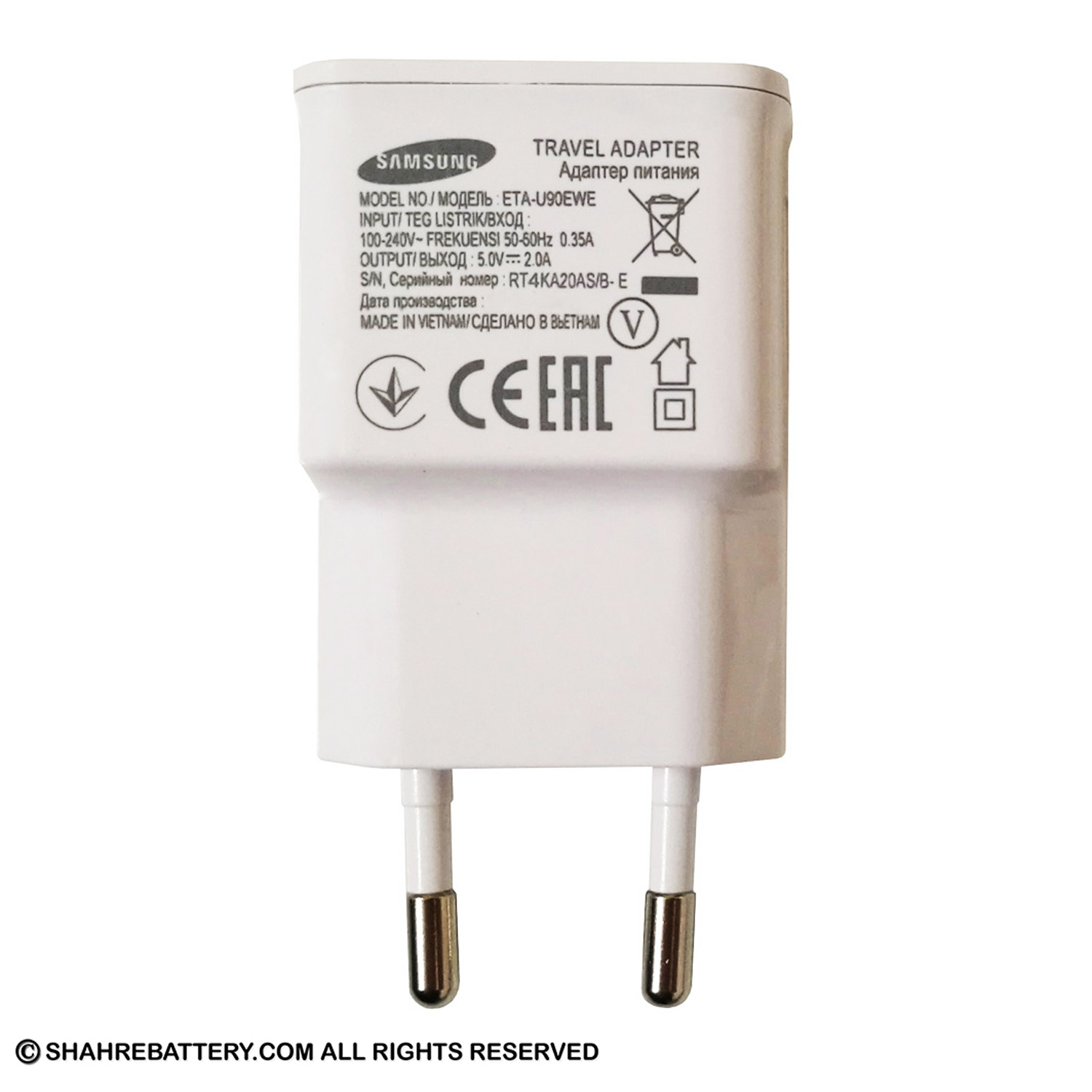 شارژر دیواری سامسونگ با ولتاژ ورودی 100 تا 240 ولت و شدت جریان 0.35 آمپر دارای یک درگاه USB با ولتاژ خروجی 5 ولت و جریان 2 آمپر می باشد. این آداپتور با تمام مدل های سامسونگ و سایر دستگاه های اندرویدی سازگار می باشد.