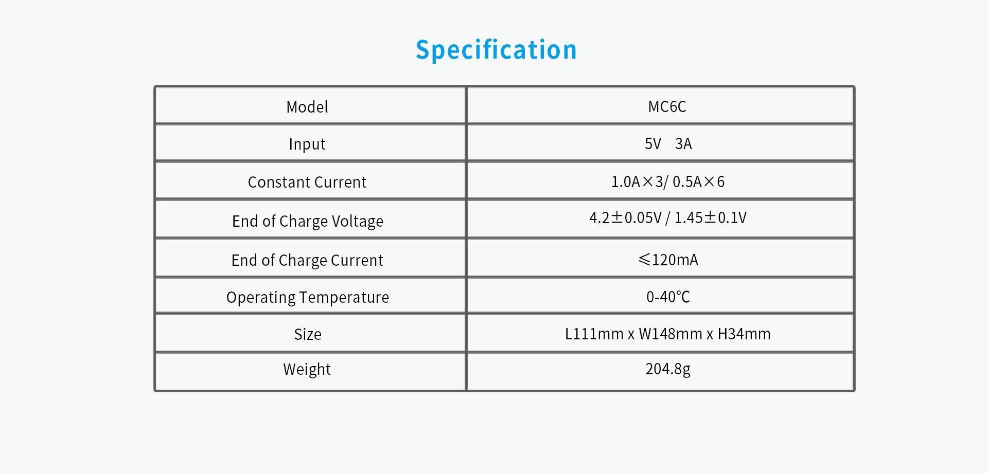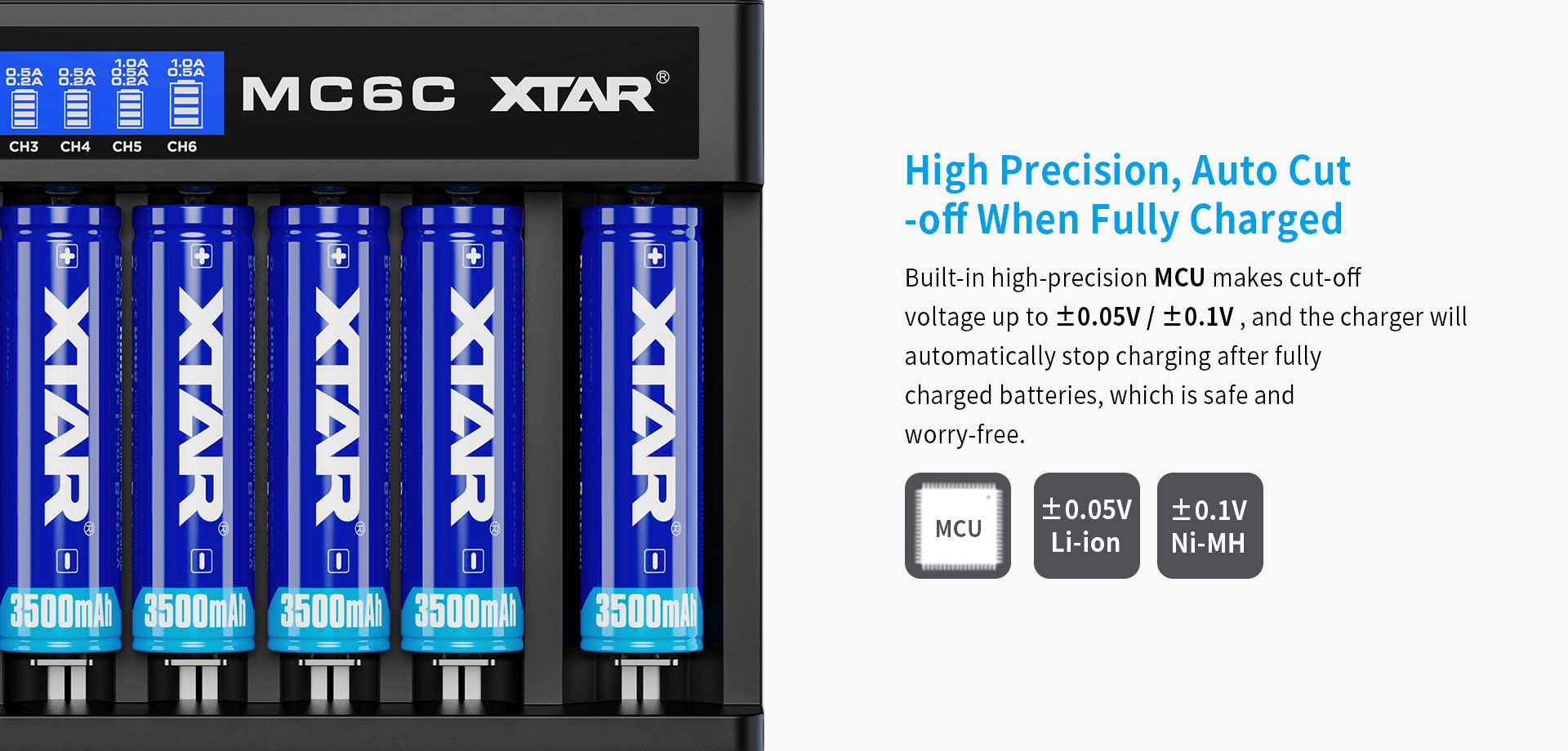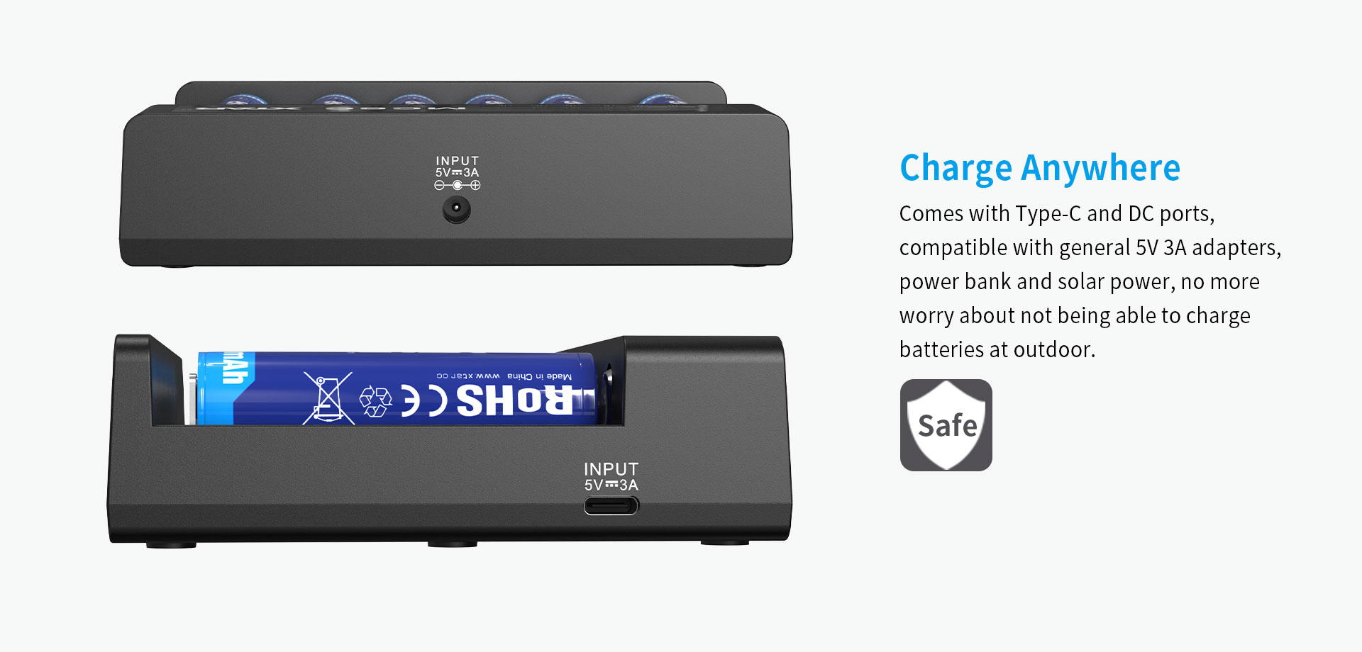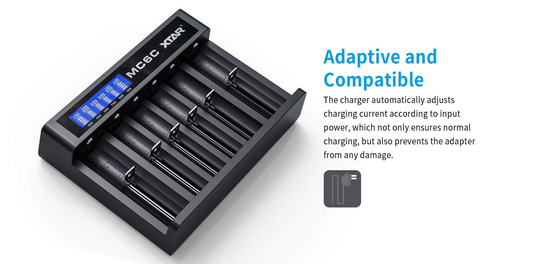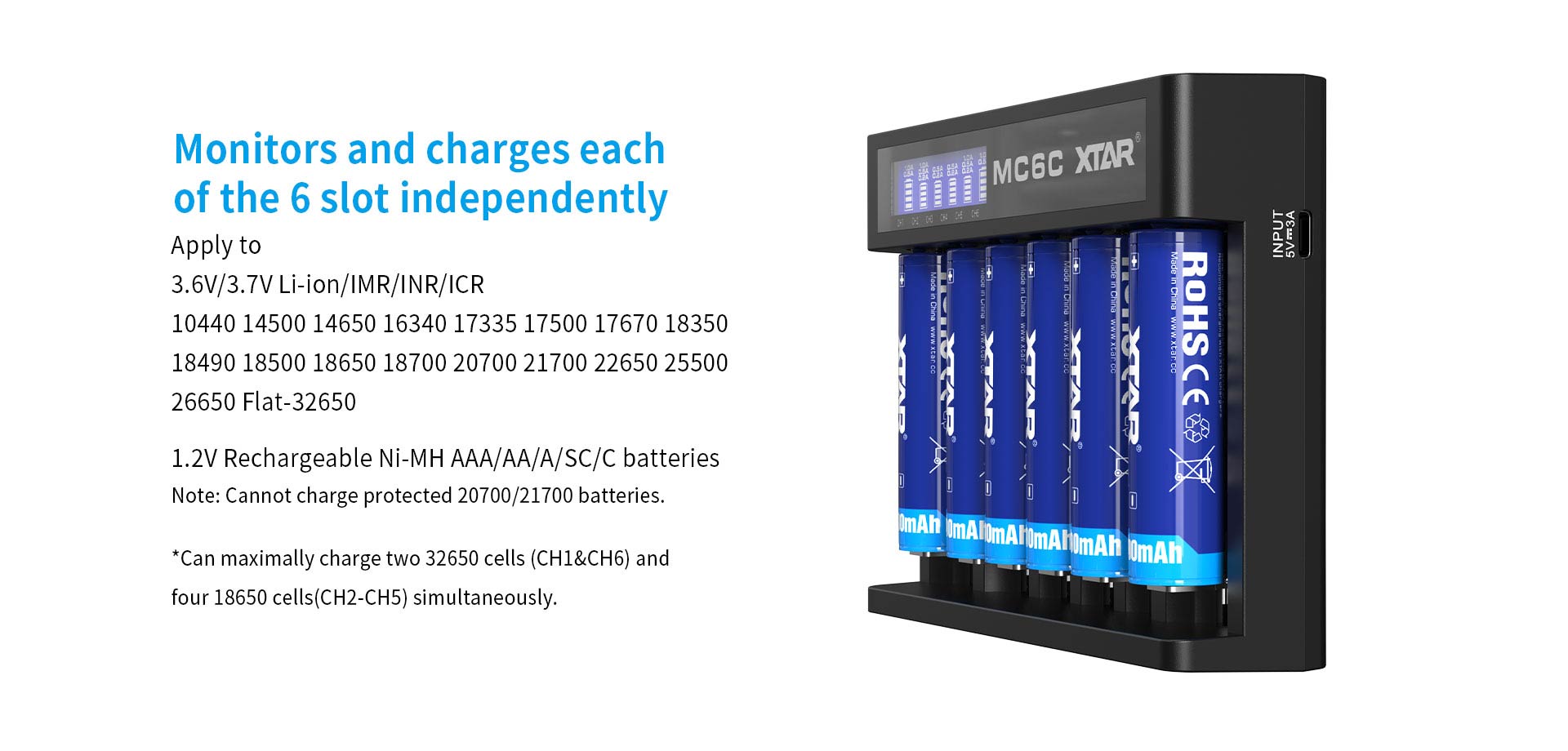 18650 , 18700 , 20700 , 21700 , 22650 , 25500 , 26650 1.2V : AAAA / AAA / AA / A / SC / C |