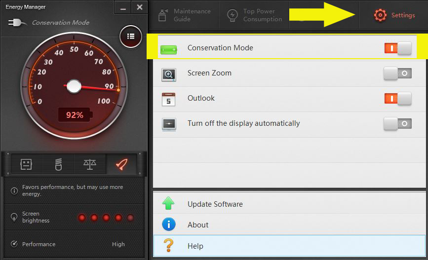 در انتها نیز برای افزایش طول عمر باتری خود، بهتر است از گزینه Conservation Mode که در نرم افزار Energy Manager موجود است استفاده نمایید. با فعال کردن این گزینه هنگامی که لپ تاپ به برق متصل است، با رسیدن شارژ باتری به 60 درصد، باتری از مدار خارج شده و لپ تاپ مستقیما انرژی خود را از برق شهری خواهد گرفت. پیشنهاد ما به شما، فعال کردن این گزینه در هنگام بازی یا انجام کارهای سنگین است که باعث می شود لپ تاپ در حین انجام پردازش های سنگین انرژی خود را از برق شهری گرفته و فشاری به باتری وارد نشود.